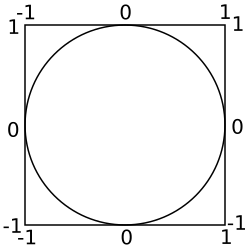 So, how are we going to figure out what Pi is? Let's start with a 2 by 2 square that has a circle in the middle. To simplify the maths, we're going to say that the center of the circle is the point (0, 0), and the circle has a radius of 1. This makes the area of this circle Pi.