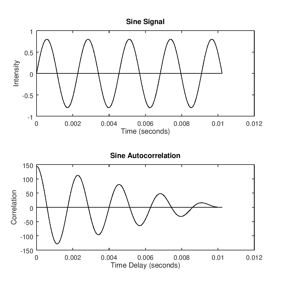If we go back to when we were looking at the signals earlier, we know that our signal repeats itself. This means that at some point while increasing our delay, we will reach a point where the signal is highly correlated with its delayed version.