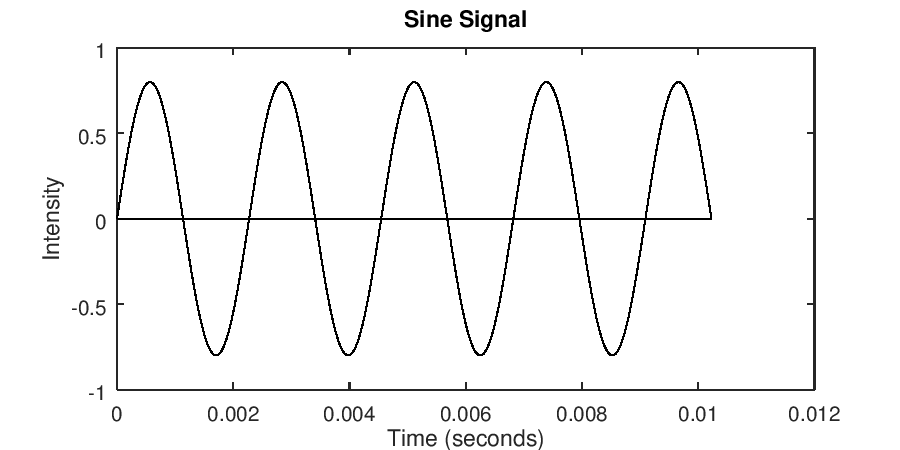 Something that you should notice here is the sort of timescales we're working on. We can fit 5 complete repetitions of the waveform in under 0.012 seconds. This shows that even if the music you're working with is changing notes quickly, there is probably enough data to identify the pitch of each individual note. On the other hand, I chose the number of repetitions to show based on what looks good on a graph, so you might need to tweak the amount of sound you use depending on which techniques you're using and the precision you need.