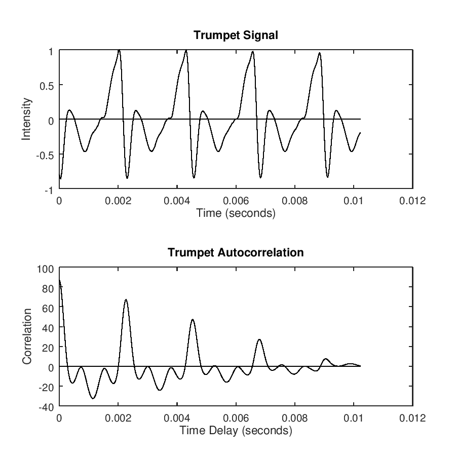 Personally, I find the Auto-Correlation approach easier to reason about. This is especially true when it comes to the trumpet signal, which has a more complicated Fourier Transform output. I also like how I can get better precision using Auto-Correlation without needing to use a longer recording. At this point, my codebase actually has both of these techniques implemented, and even though it's using the Auto-Correlation to choose the current pitch, it prints out a graph of both the Fourier Transform and the Auto-Correlation to help me to debug any issues I might be having.